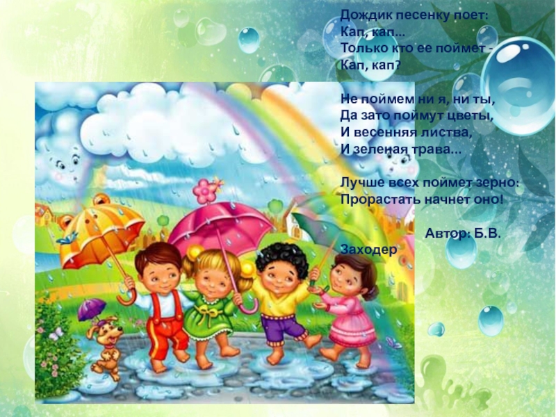Дождик песенку поет:Кап, кап...Только кто ее поймет -Кап, кап?Не поймем ни я, ни ты,Да зато поймут цветы,И