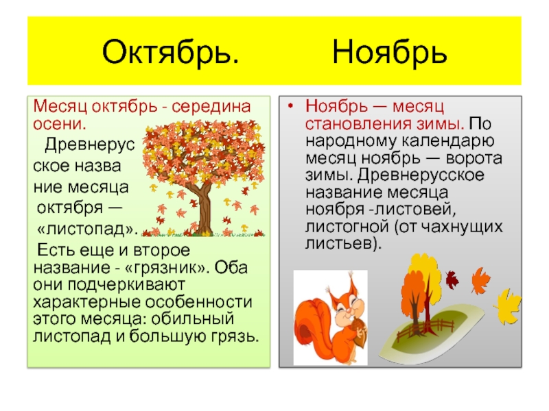 Ноябрь — месяц становления зимы. По народному календарю месяц ноябрь — ворота зимы. Древнерусское название месяца ноября -листовей, листогной (от чахнущих листьев).