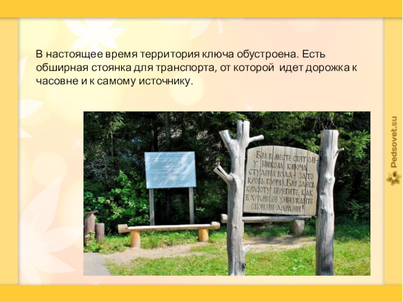Слайд 8В настоящее время территория ключа обустроена. Есть обширная стоянка для транспорта,
