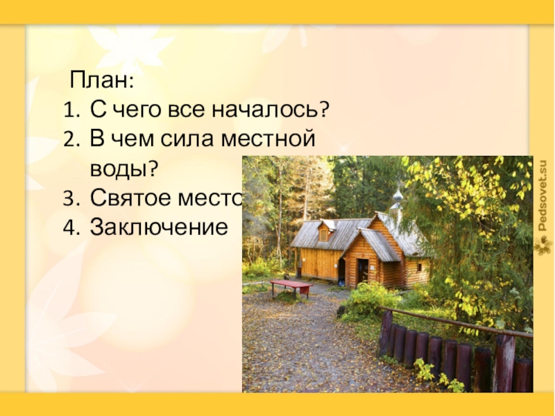 План:С чего все началось?В чем сила местной воды?Святое местоЗаключение