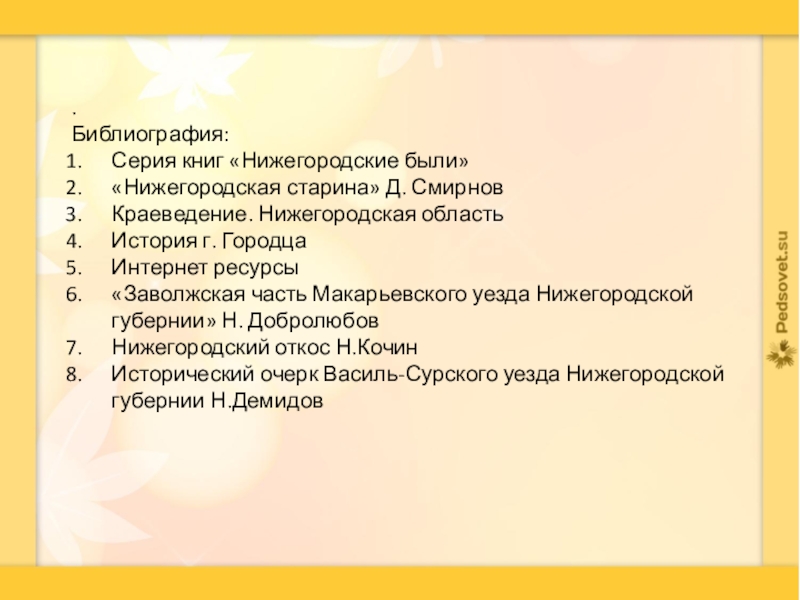 .Библиография:Серия книг «Нижегородские были»«Нижегородская старина» Д. СмирновКраеведение. Нижегородская областьИстория г. ГородцаИнтернет ресурсы«Заволжская часть Макарьевского уезда Нижегородской губернии»