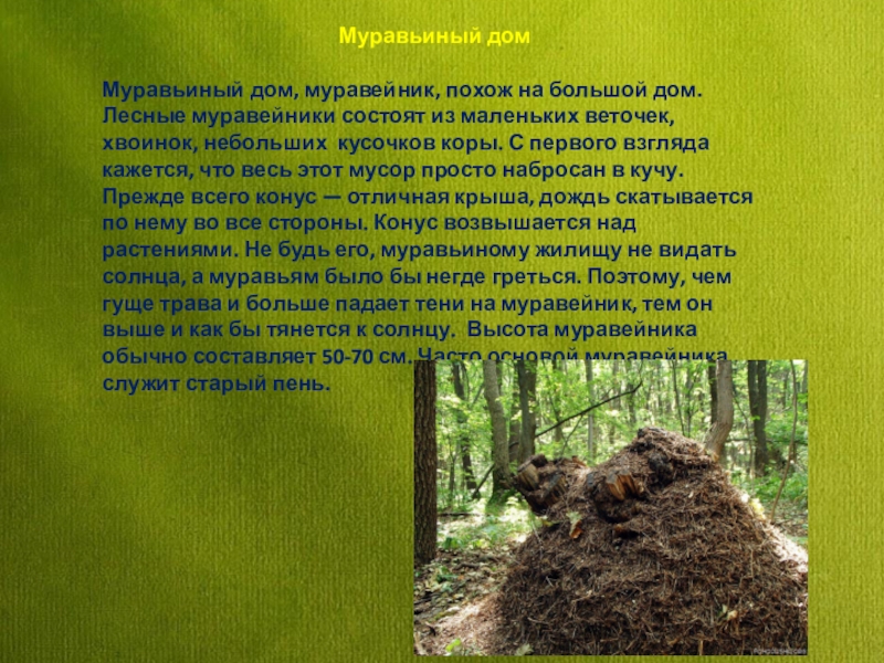 из маленьких веточек, хвоинок, небольших кусочков коры. С первого взгляда кажется, что весь этот мусор просто набросан в кучу. Прежде всего конус — отличная крыша, дождь скатывается по нему во все стороны. Конус возвышается над растениями. Не будь его, муравьиному жилищу не видать солнца, а муравьям было бы негде греться. Поэтому, чем гуще трава и больше падает тени на муравейник, тем он выше и как бы тянется к солнцу. Высота муравейника обычно составляет 50-70 см. Часто основой муравейника служит старый пень.