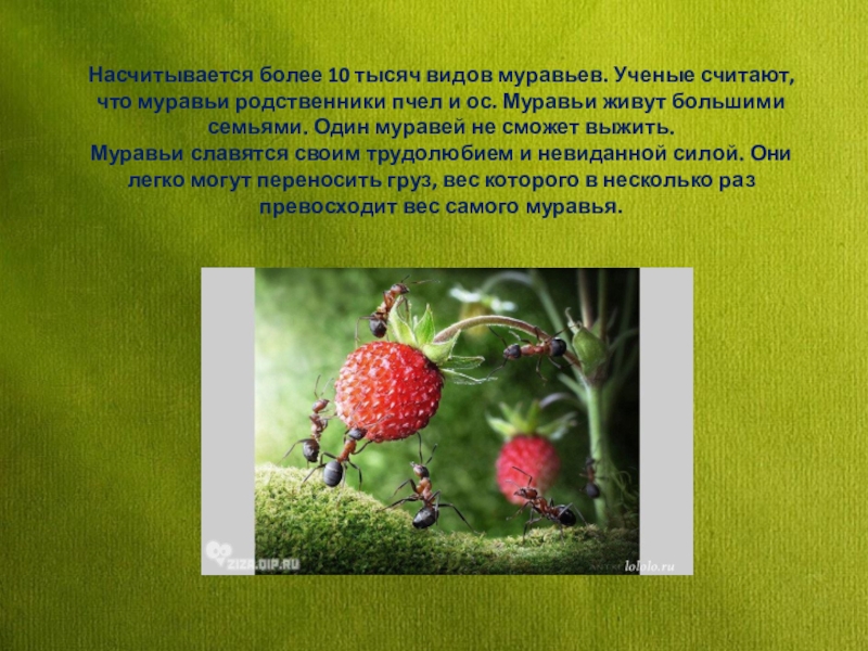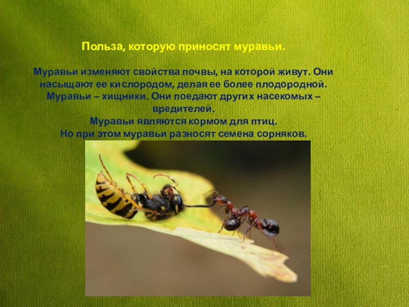 насыщают ее кислородом, делая ее более плодородной. Муравьи – хищники. Они поедают других насекомых – вредителей.