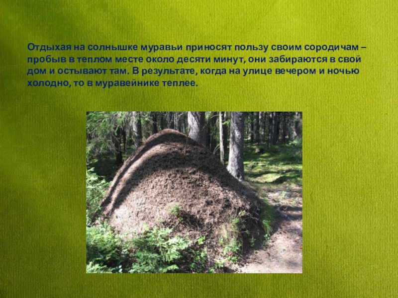 теплом месте около десяти минут, они забираются в свой дом и остывают там. В результате, когда на улице вечером и ночью холодно, то в муравейнике теплее.