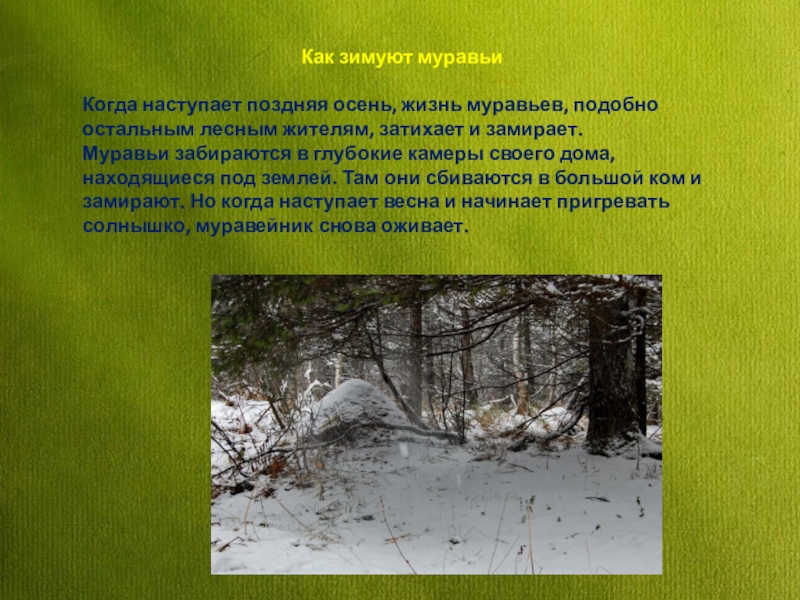 Муравьи забираются в глубокие камеры своего дома, находящиеся под землей. Там они сбиваются в большой ком и замирают. Но когда наступает весна и начинает пригревать солнышко, муравейник снова оживает.