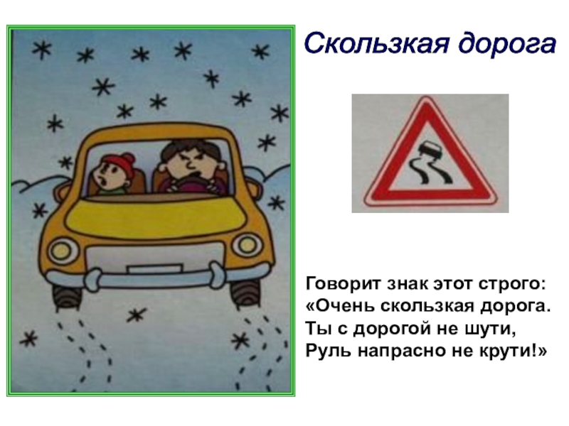 Скользкая дорога Говорит знак этот строго:«Очень скользкая дорога.Ты с дорогой не шути,Руль напрасно не крути!»