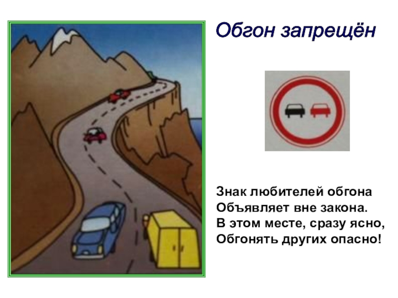 Обгон запрещён Знак любителей обгонаОбъявляет вне закона.В этом месте, сразу ясно,Обгонять других опасно!