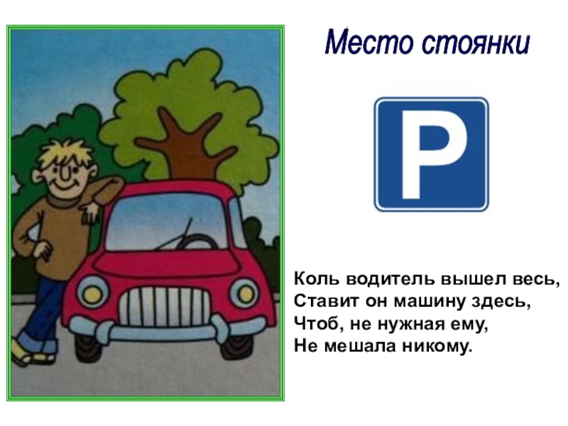 Место стоянки Коль водитель вышел весь,Ставит он машину здесь,Чтоб, не нужная ему,Не мешала никому.