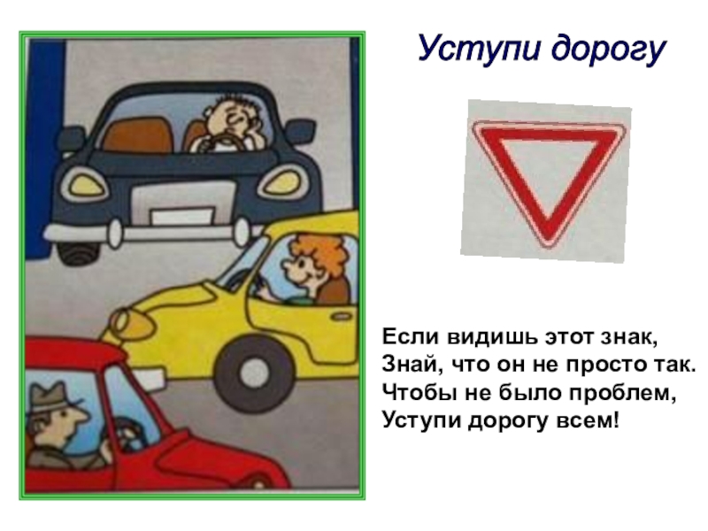 Уступи дорогу Если видишь этот знак,Знай, что он не просто так.Чтобы не было проблем,Уступи дорогу всем!