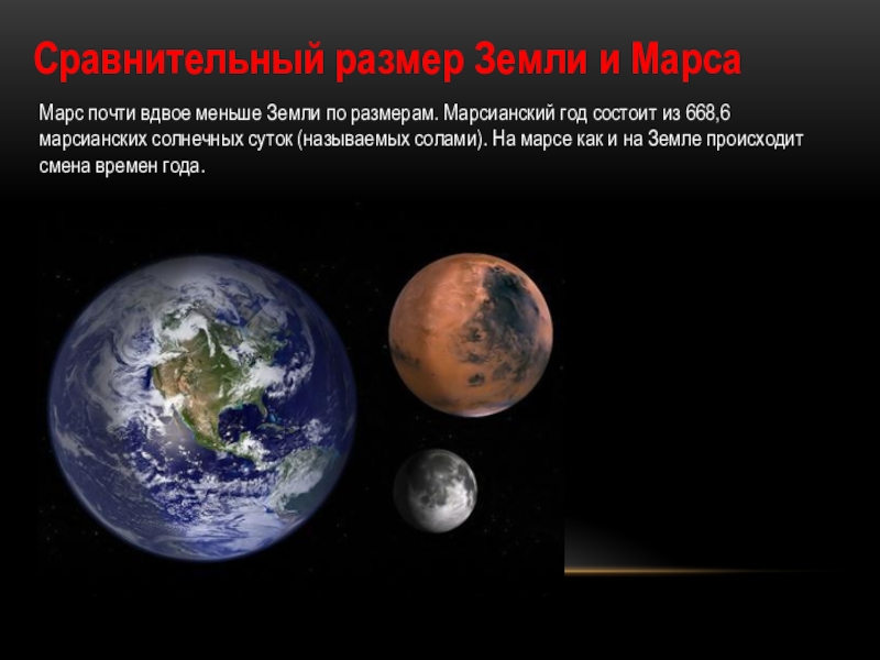 Сравнительный размер Земли и МарсаМарс почти вдвое меньше Земли по размерам. Марсианский год состоит из 668,6 марсианских солнечных суток (называемых солами). На марсе как и на Земле происходит смена времен года.
