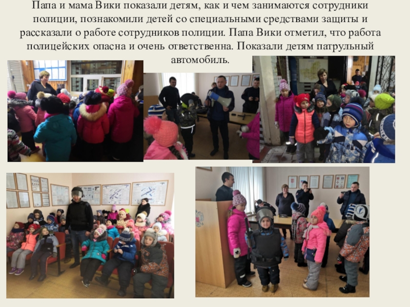 полиции, познакомили детей со специальными средствами защиты и рассказали о работе сотрудников полиции. Папа Вики отметил, что работа полицейских опасна и очень ответственна. Показали детям патрульный автомобиль.