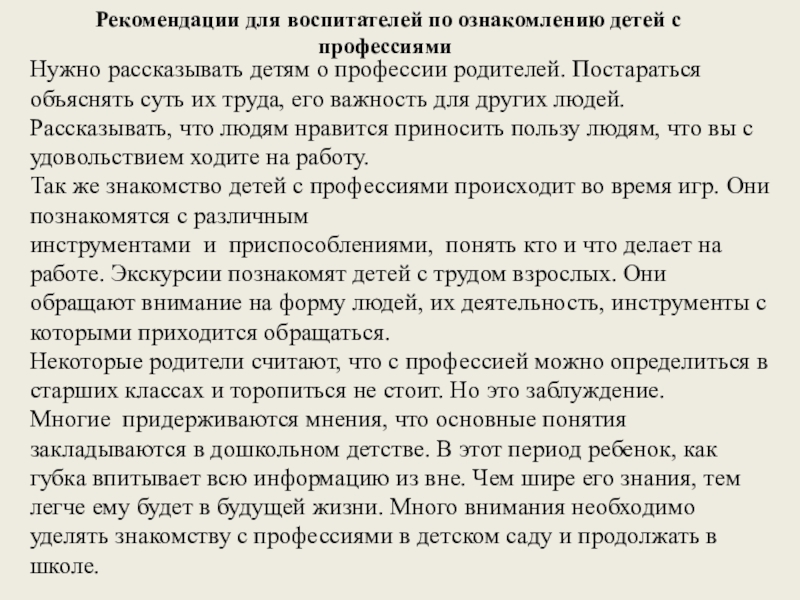 Рекомендации для воспитателей по ознакомлению детей с профессиями