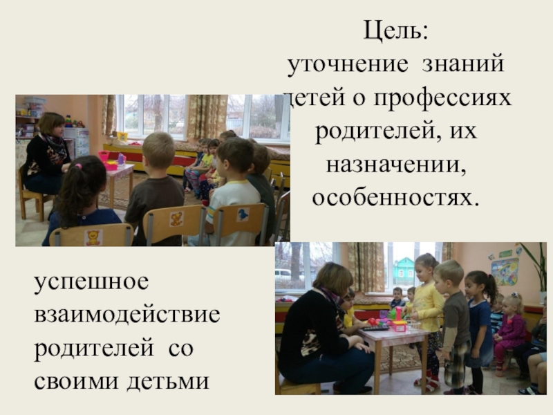 Слайд 11Цель: уточнение знаний детей о профессиях родителей, их назначении, особенностях.