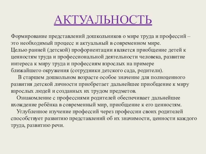 Ознакомление с профессиями родителей обеспечивает дальнейшее вхождение ребёнка в современный мир, приобщение к его ценностям.