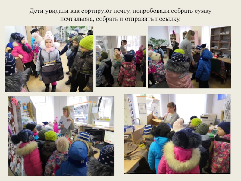 Слайд 18Дети увидали как сортируют почту, попробовали собрать сумку почтальона, собрать и