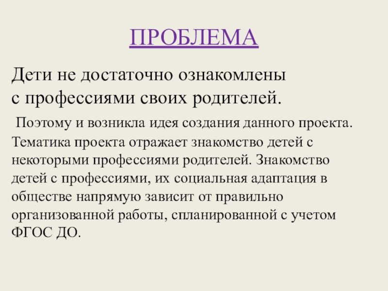 создания данного проекта. Тематика проекта отражает знакомство детей с некоторыми профессиями родителей. Знакомство детей с профессиями, их социальная адаптация в обществе напрямую зависит от правильно организованной работы, спланированной с учетом ФГОС ДО.