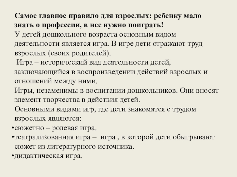 Слайд 24Самое главное правило для взрослых: ребенку мало знать о профессии, в
