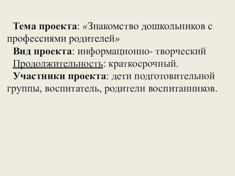 Слайд 6Тема проекта: «Знакомство дошкольников с профессиями родителей»