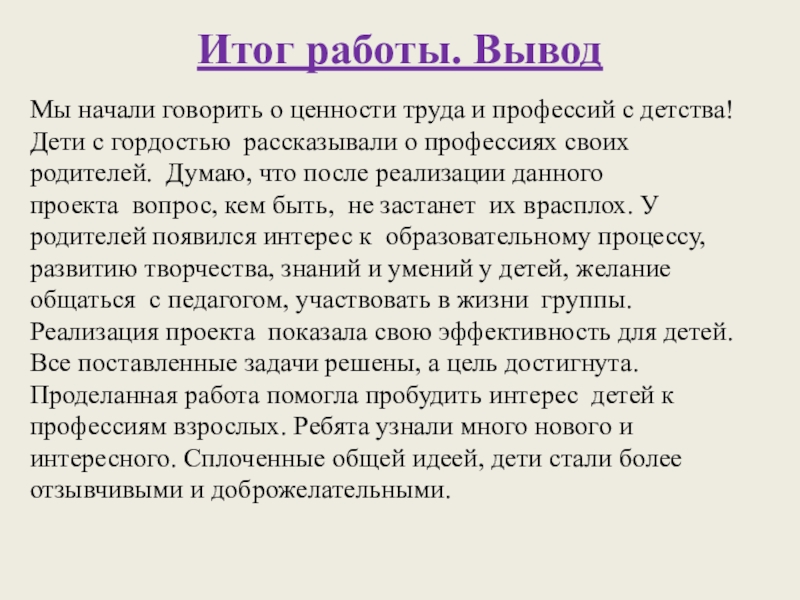 Реализация проекта показала свою эффективность для детей. Все поставленные задачи решены, а цель достигнута. Проделанная работа помогла пробудить интерес детей к профессиям взрослых. Ребята узнали много нового и интересного. Сплоченные общей идеей, дети стали более отзывчивыми и доброжелательными.