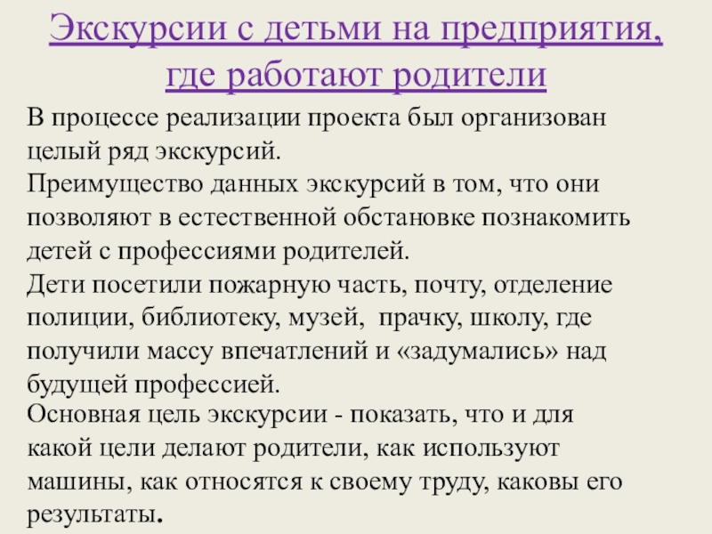 Слайд 15Экскурсии с детьми на предприятия, где работают родители