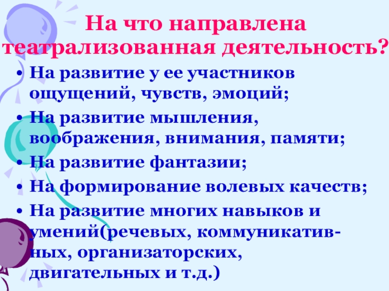 На что направлена театрализованная деятельность?На развитие у ее участников ощущений, чувств, эмоций;На развитие мышления, воображения, внимания, памяти;На развитие фантазии;На формирование волевых качеств;На развитие многих навыков и умений(речевых, коммуникатив-ных, организаторских, двигательных и т.д.)