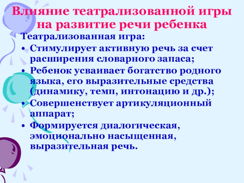 Слайд 3Влияние театрализованной игры на развитие речи ребенка