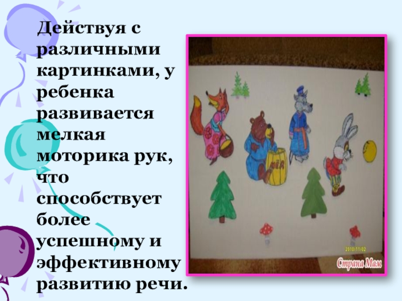 Слайд 7 Действуя с различными картинками, у ребенка развивается мелкая моторика