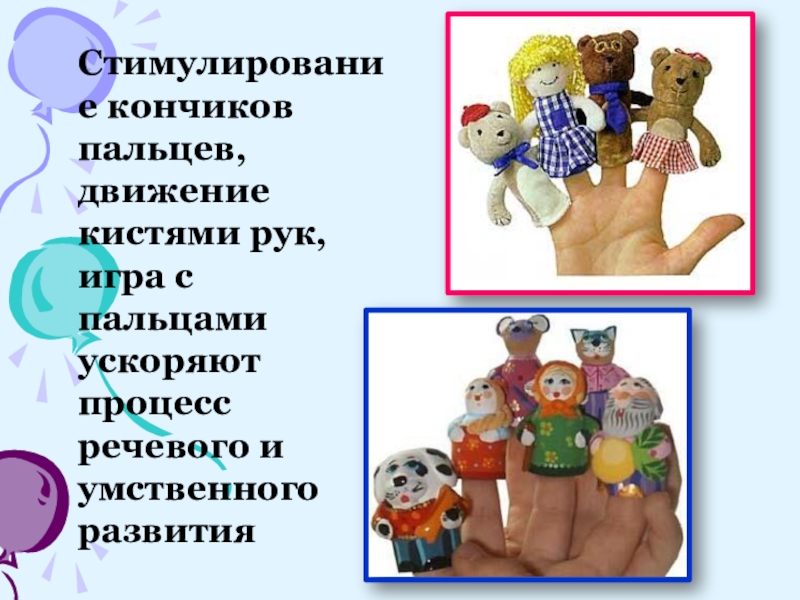 Слайд 5 Стимулирование кончиков пальцев, движение кистями рук, игра с пальцами