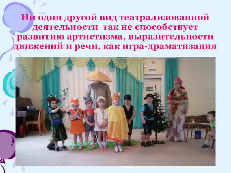 Ни один другой вид театрализованной деятельности так не способствует развитию артистизма, выразительности движений и речи, как игра-драматизация