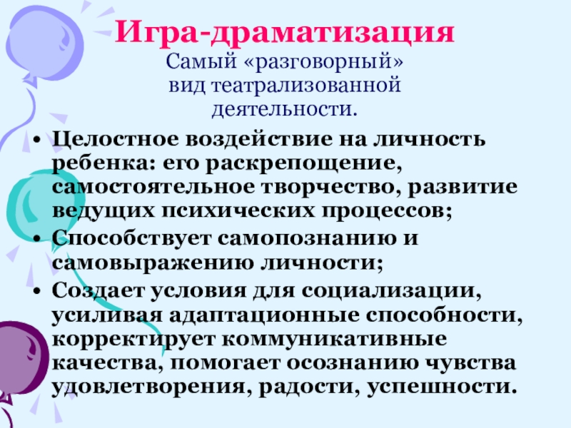 Игра-драматизация Самый «разговорный» вид театрализованной деятельности. Целостное воздействие на личность ребенка: его раскрепощение,