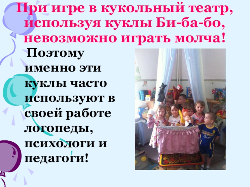 Слайд 13При игре в кукольный театр, используя куклы Би-ба-бо, невозможно играть молча!
