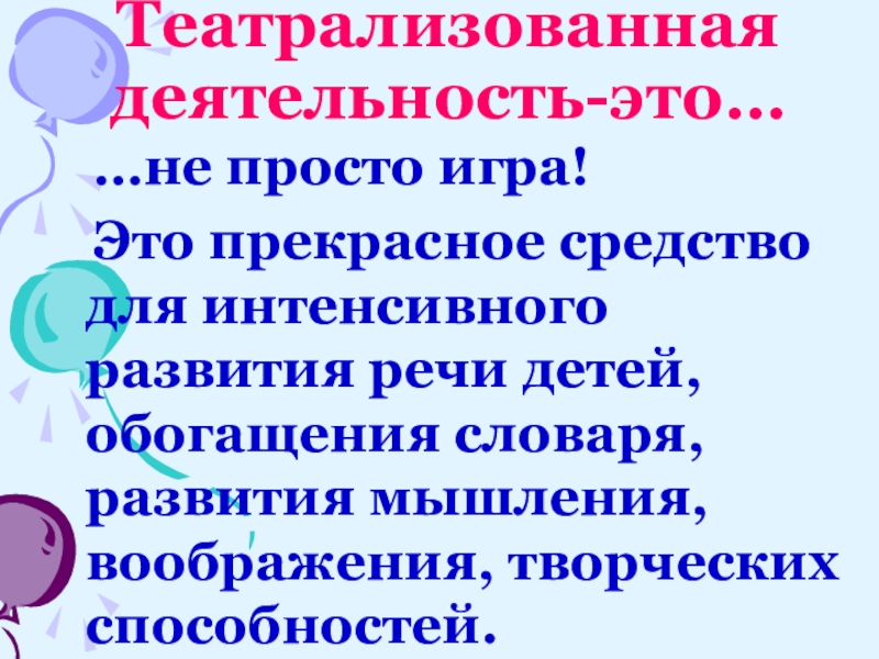 Театрализованная деятельность-это…  …не просто игра!  Это прекрасное средство для интенсивного развития речи детей, обогащения словаря,