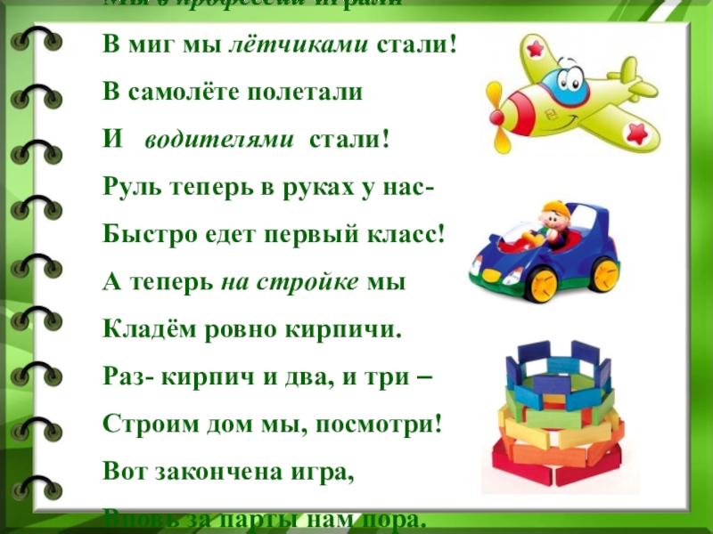 Мы в профессии играли –В миг мы лётчиками стали!В самолёте полеталиИ  водителями стали!Руль теперь в руках