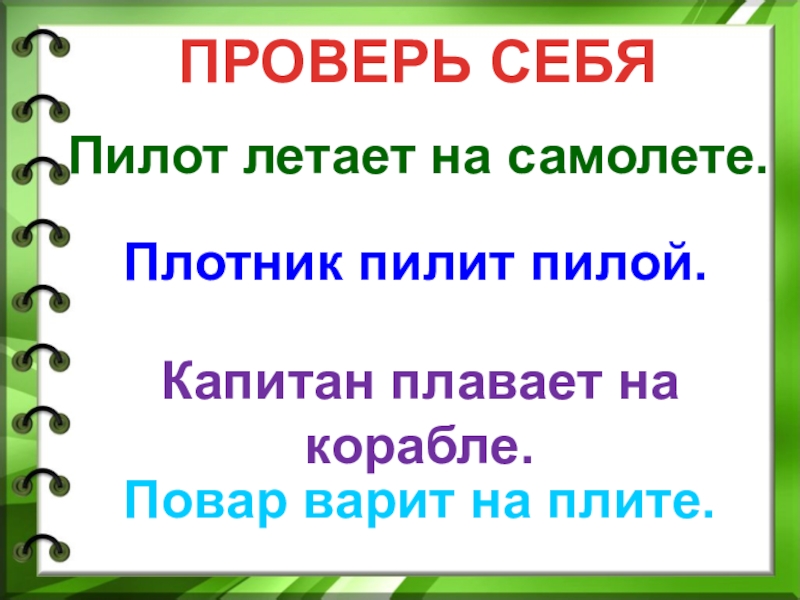 ПРОВЕРЬ СЕБЯПилот летает на самолете.Плотник пилит пилой.Капитан плавает на корабле.Повар варит на плите.