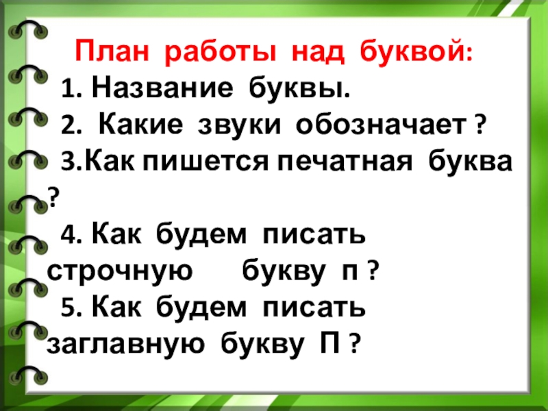 звуки обозначает ? 3.Как пишется печатная буква ? 4. Как будем писать строчную букву п ? 5. Как будем писать заглавную букву П ?