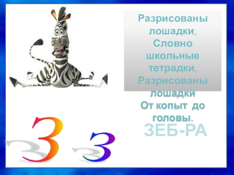 ЗЕБ-РАЗ з Разрисованы лошадки,Словно школьные тетрадки,Разрисованы лошадкиОт копыт до головы.