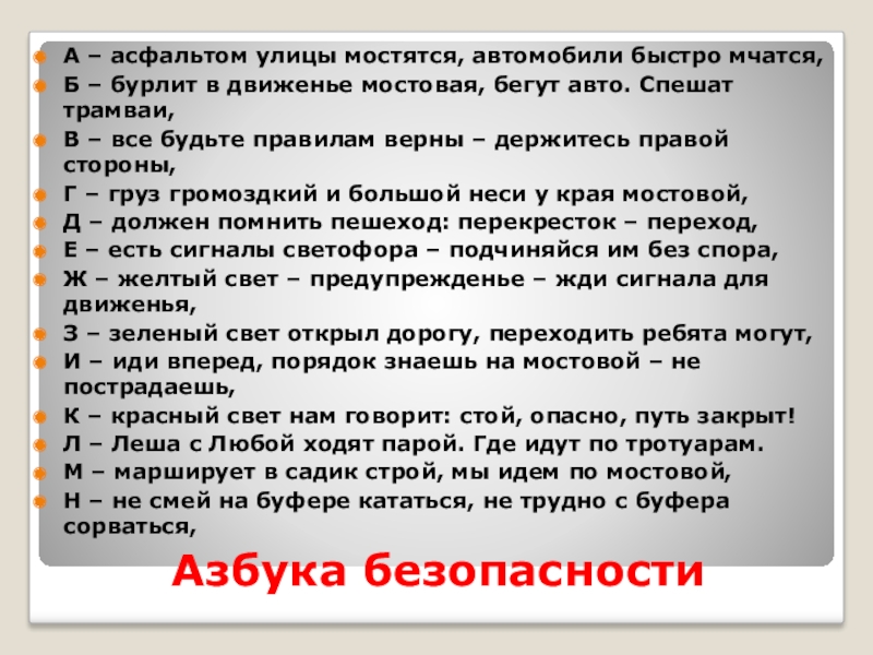 А – асфальтом улицы мостятся, автомобили быстро мчатся,