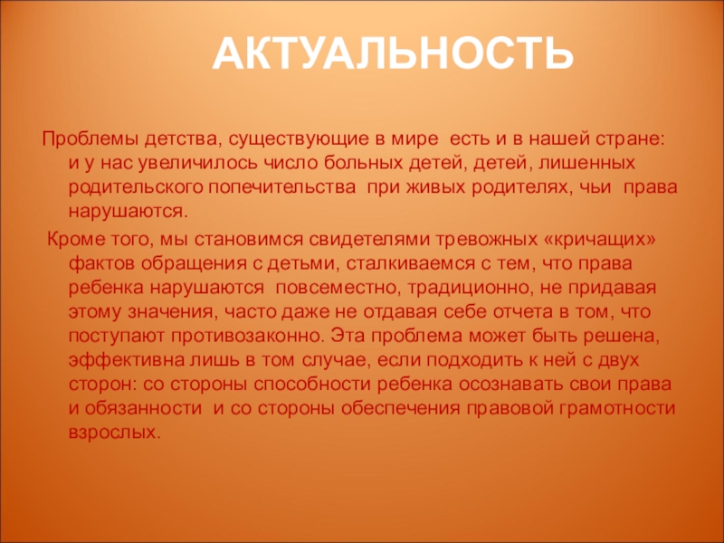 Кроме того, мы становимся свидетелями тревожных «кричащих» фактов обращения с детьми, сталкиваемся с тем, что права ребенка нарушаются повсеместно, традиционно, не придавая этому значения, часто даже не отдавая себе отчета в том, что поступают противозаконно. Эта проблема может быть решена, эффективна лишь в том случае, если подходить к ней с двух сторон: со стороны способности ребенка осознавать свои права и обязанности и со стороны обеспечения правовой грамотности взрослых.