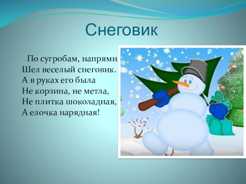 Снеговик	По сугробам, напрямик  Шел веселый снеговик.  А в руках его была  Не корзина, не метла,  Не плитка