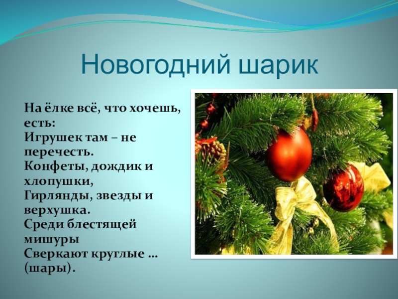 Новогодний шарик На ёлке всё, что хочешь, есть: Игрушек там – не перечесть. Конфеты, дождик и хлопушки,