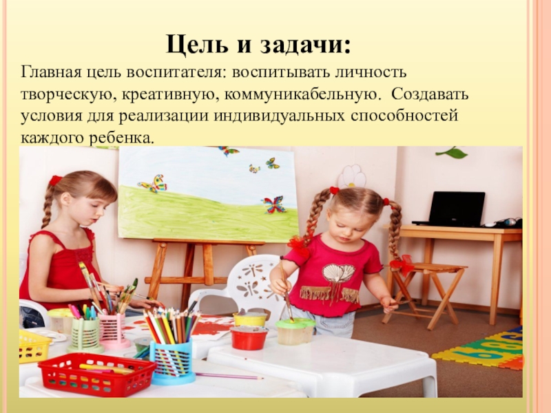 Цель и задачи:Главная цель воспитателя: воспитывать личность творческую, креативную, коммуникабельную.  Создавать условия для реализации индивидуальных способностей каждого ребенка.