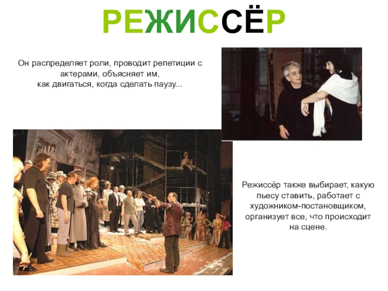 Режиссёр также выбирает, какую пьесу ставить, работает с художником-постановщиком,