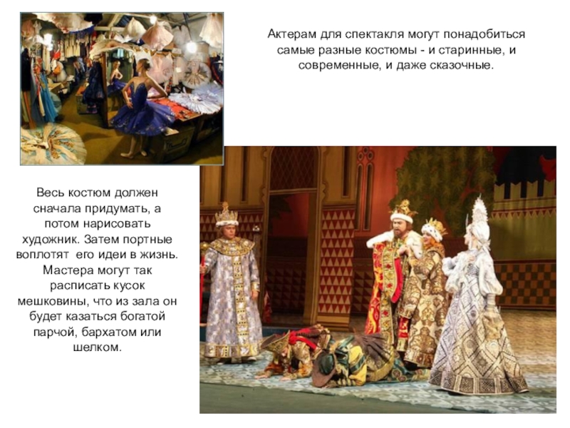 Весь костюм должен сначала придумать, а потом нарисовать художник. Затем портные воплотят его идеи в жизнь.