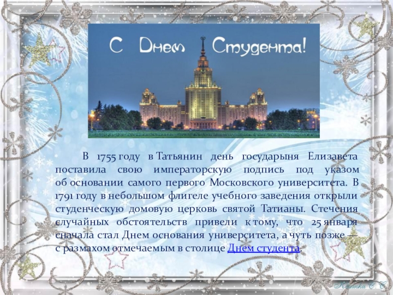 указом об основании самого первого Московского университета. В 1791 году в небольшом флигеле учебного заведения открыли студенческую домовую церковь святой Татианы. Стечения случайных обстоятельств привели к тому, что 25 января сначала стал Днем основания университета, а чуть позже — с размахом отмечаемым в столице Днем студента.
