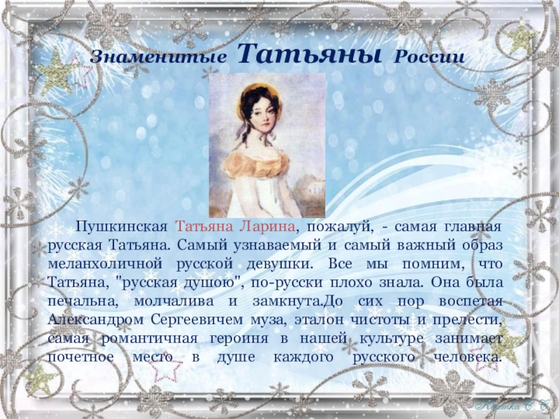 Пушкинская Татьяна Ларина, пожалуй, - самая главная русская Татьяна.