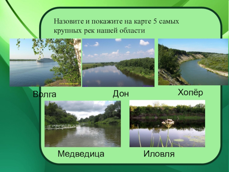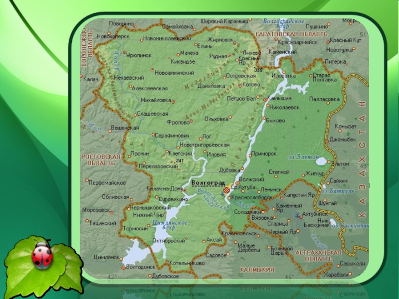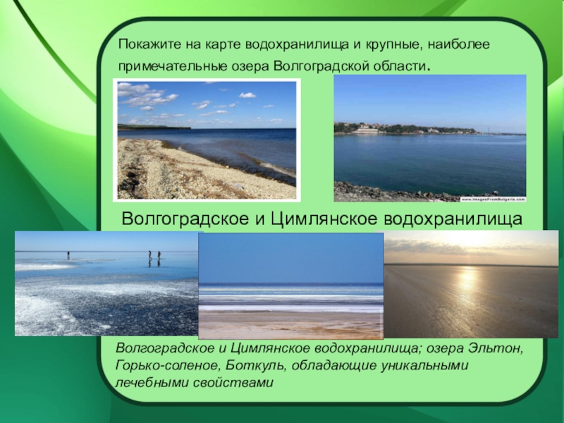 Волгоградское и Цимлянское водохранилища; озера Эльтон, Горько-соленое, Боткуль, обладающие уникальными лечебными свойствами