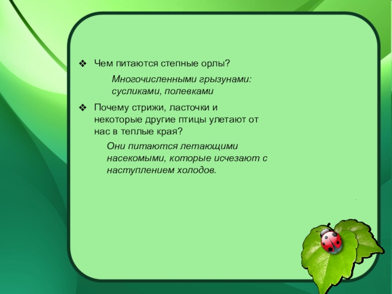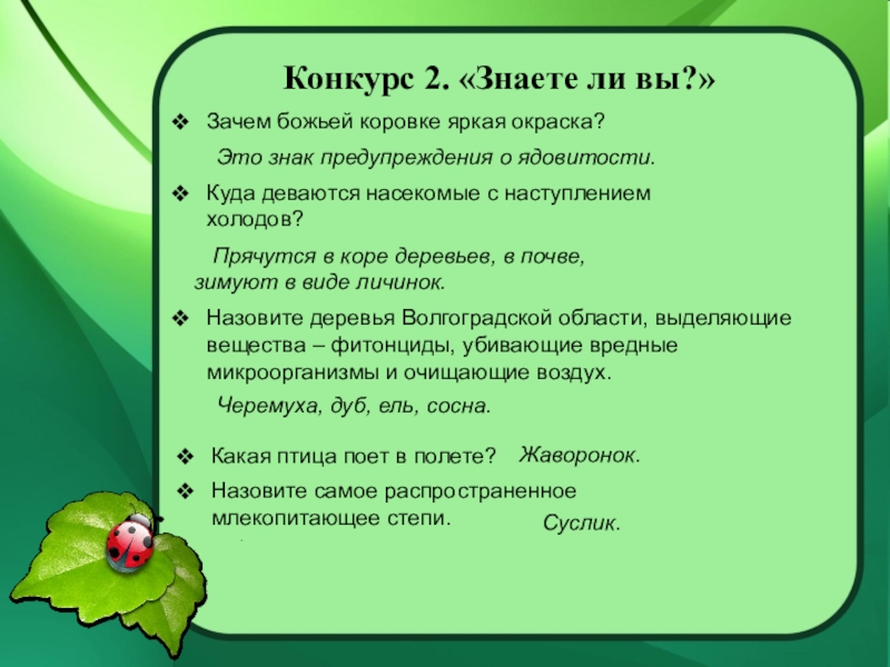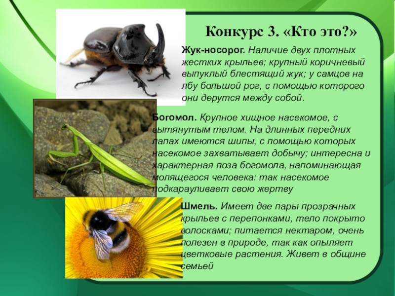 Богомол. Крупное хищное насекомое, с вытянутым телом. На длинных передних лапах имеются шипы, с помощью которых насекомое захватывает добычу; интересна и характерная поза богомола, напоминающая молящегося человека: так насекомое подкарауливает свою жертву