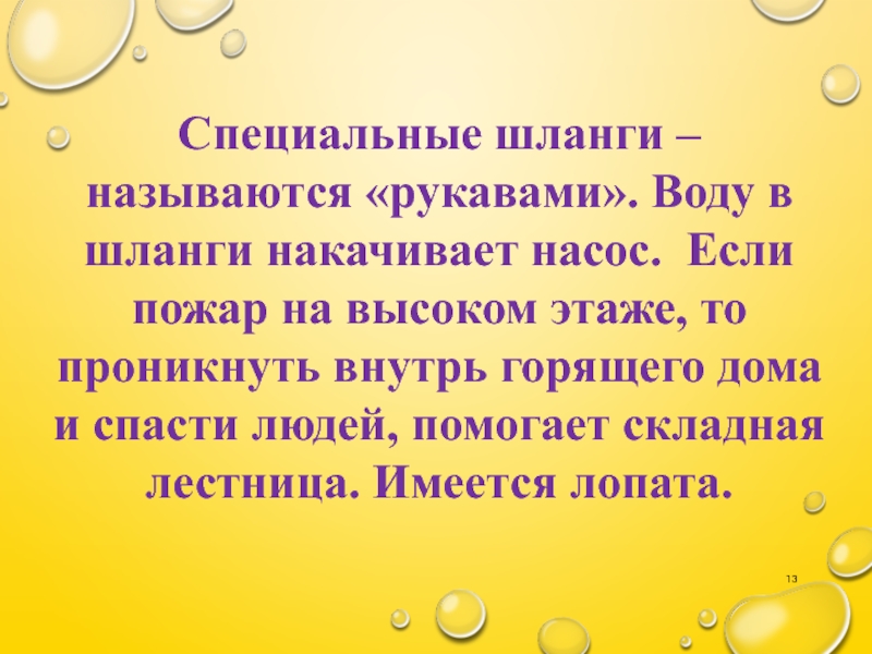 Слайд 13Специальные шланги – называются «рукавами». Воду в шланги накачивает насос. Если