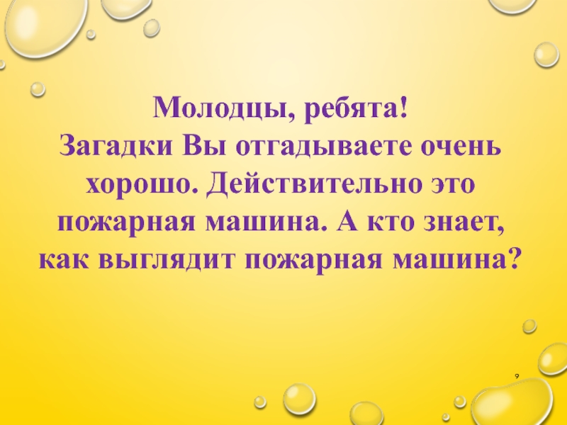 Загадки Вы отгадываете очень хорошо. Действительно это пожарная машина. А