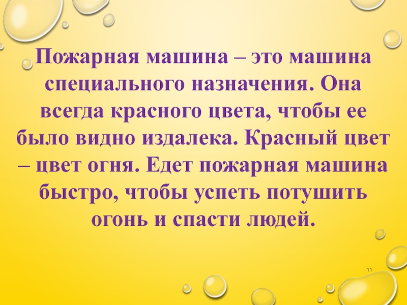 чтобы ее было видно издалека. Красный цвет – цвет огня. Едет пожарная машина быстро, чтобы успеть потушить огонь и спасти людей.
